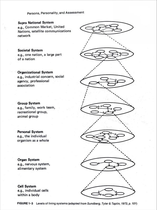 Nedanstående bild illusterar att människan är del av olika system. Den visar allt ifrån cellnivå nederst, till hur kroppens eget inre system fungerar, till det psykologiska, organisatoriska, sociologiska, samhällssystem osv. För att förstå varför en människa inte fungerar som den vill/ska behöver man inkludera så många system som det går.